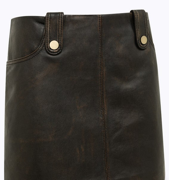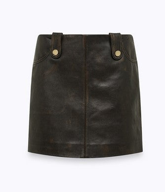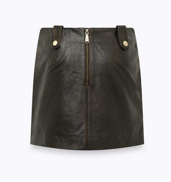 Non passerà inosservata la gonna in pelle trattata. Ha taglio centrale, linea dritta, passanti in vita con bottoni in metallo, tasche laterali, chiusura con zip sul retro, foderata. Punto di forza dei tuoi look metropolitani.