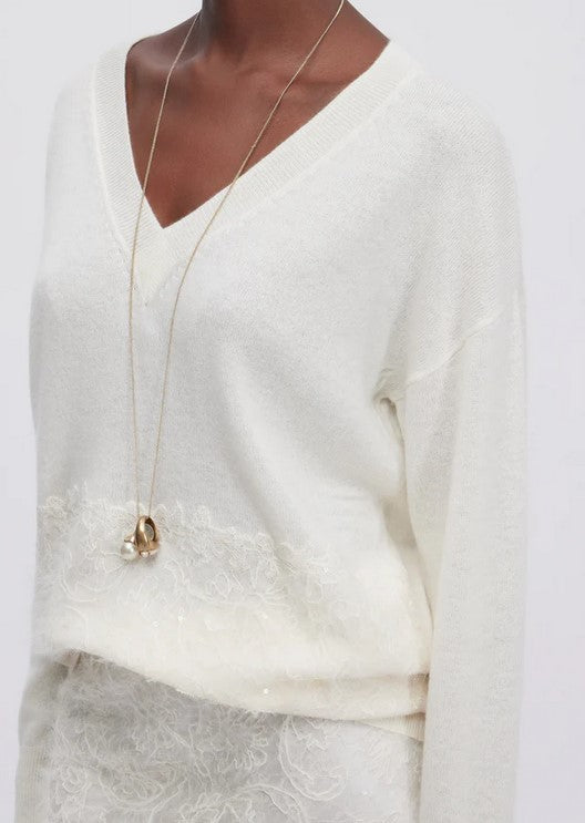 Maglia fine di lana e cachemire con scollo a V e inserto di pizzo ricamato con mohair e paillettes sul fondo davanti. Volume morbido.